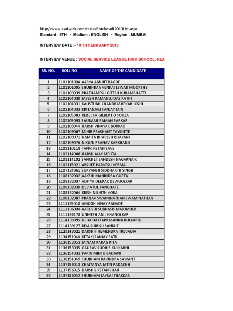 Homi Bhabha Result 6th Std 23 1 13 Mumbai